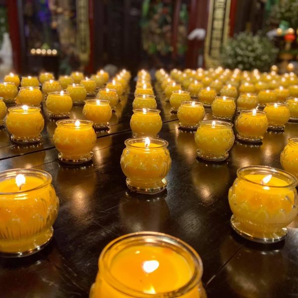 – Bước 3: Chờ sáp nguội hẳn rót thêm 1 lượt nữa cho bề mặt sáp bóng mịn, rắc thêm kim tuyến để trang trí (nếu muốn)